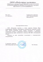 ООО «Идустрия Чистоты» и лично генеральный директор Пятяевва Инна Станиславовна, объявляет благодарность руководителю сервисной службы ООО «Чистая Компания» за оказанную оперативную помощь в разрешении вопросов связанных с проведением пусконаладочных работ автомоечного комплекса RB 6000 в Белгородской области.